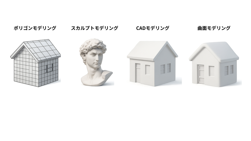 3Dモデリングには、目的や制作したい形状に応じて、主に以下の4つの手法があります。