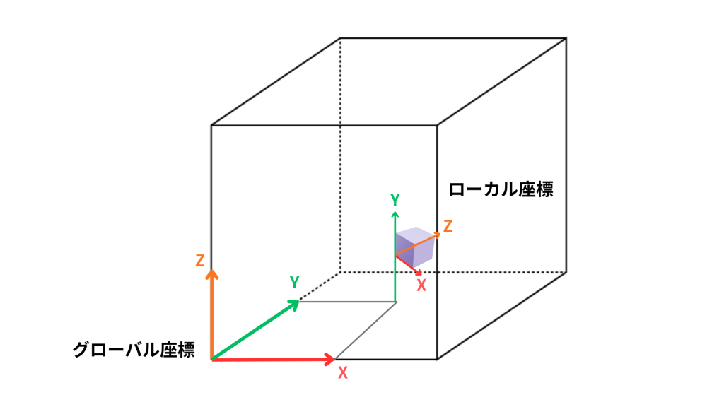 グローバル座標を持つ3D空間内に作成されたオブジェクトが、自分専用に個別に持っている座標です。オブジェクトの形状(位置や向き)を表します。