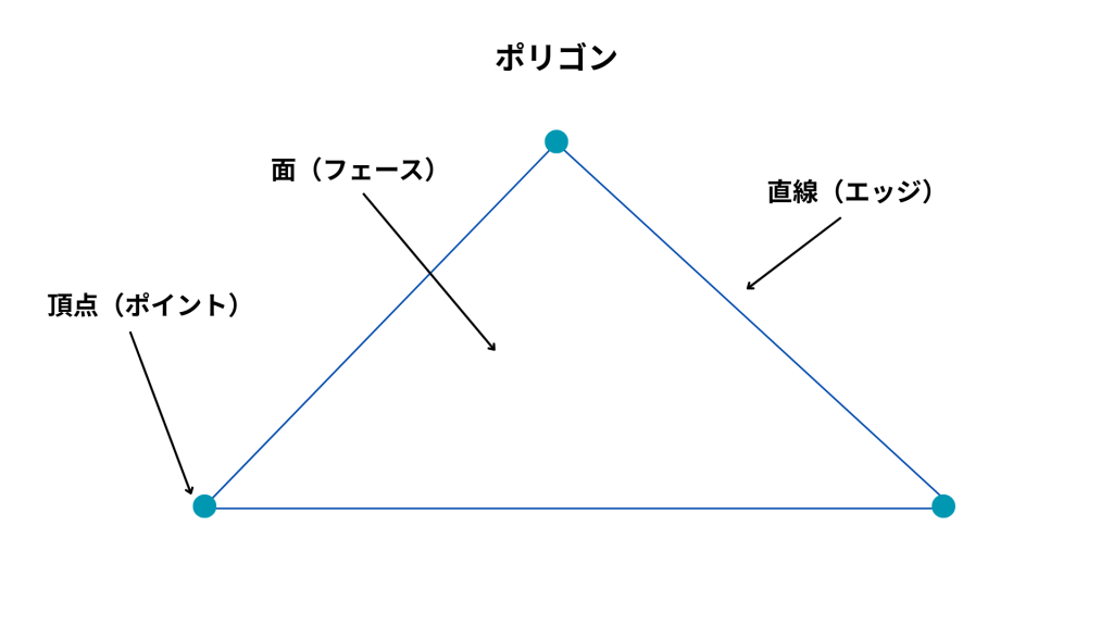 ポリゴンは、複数の頂点(ポイント)と、それらを結ぶ線(エッジ)で構成される面(フェース)のことです。一般的には、三角形や四角形が使われます。