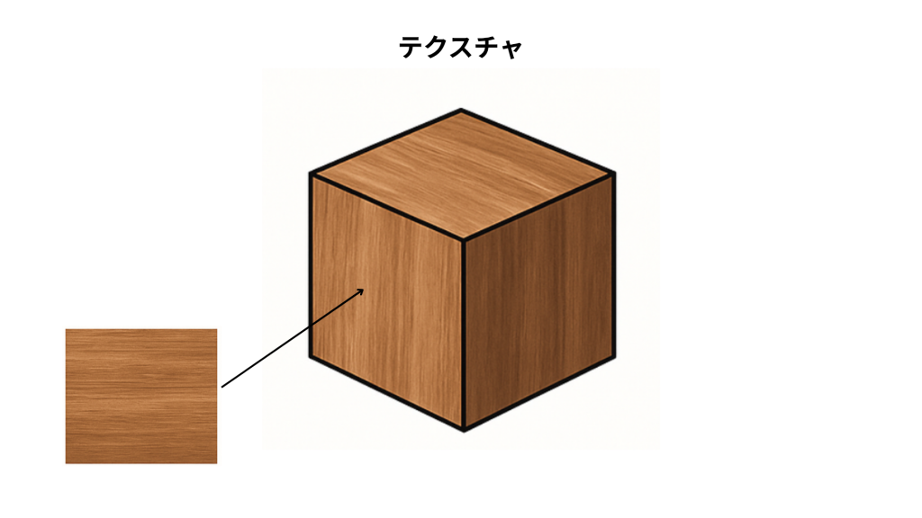 テクスチャは、木目、コンクリート、金属、布など、表面の模様や質感を表す画像データのことです。UV展開と組み合わせることで、モデルにリアルな外観を与えられます。