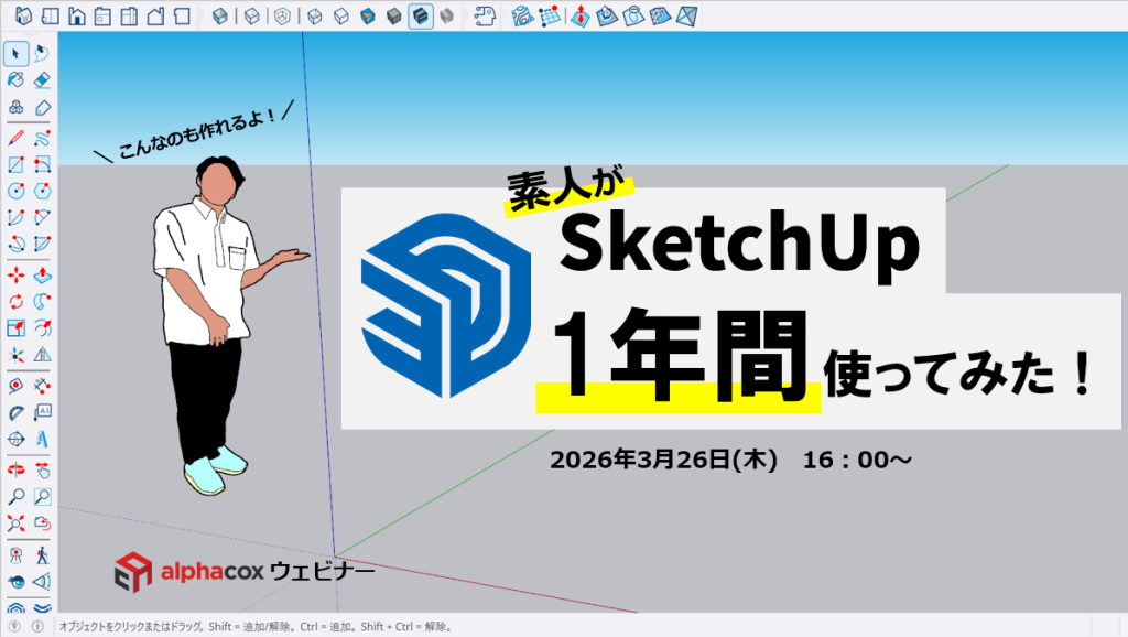 3Dや業界のことなど何も知らない「素人」が、SketchUpを1年間使ってみたらどこまでできるようになるのか!?という検証結果をウェビナーにてお話しいたします。